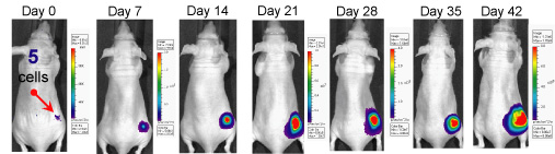 Five cancer cells were injected subcutaneously into the dorsal region near the thigh of mouse. Tumor growth is monitored weekly by an IVIS Spectrum. The tumor was visible 28 days post implantation; Bioluminescent signal could be detected in the animal long before it could be measured with a caliper.