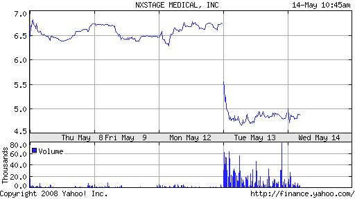 NxStage Medical, a Lawrence, MA, company that makes dialysis systems, saw its share price plummet after announcing its first quarter financial results. The company traded as high as $15 earlier this year, but closed under $5 on Tuesday.
