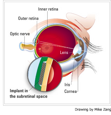 Optobionics makes the Artificial Silicon Retina (ASR) microchip, designed to stimulate damaged retinal cells, allowing them to send visual signals again to the brain. The company believes the technology has the potential to help patients suffering from retinitis pigmentos, age-related macular degeneration, and possibly other retinal conditions. The 2 mm (diameter) silicon chip that’s implanted under the retina (see below) contains approximately 5,000 microscopic solar cells called “microphotodiodes,” each with its own stimulating electrode. These microphotodiodes are designed to convert the light energy from images into electricalchemical impulses that stimulate the remaining functional cells of the retina.