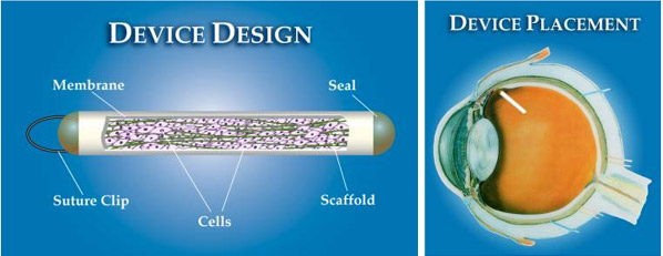 (See below.) The actual device is 6 mm in length and made from a semi-permeable hollow fiber membrane with a suture loop at one end to anchor the implant to the sclera. The device is surgically placed in the vitreous body, sutured in a manner that allows for retrieval when desired. It’s an out-patient procedure that takes about 25 minutes.